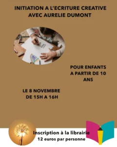 Atelier d’Initiation à l’Écriture Intuitive pour EnfantsPlongez dans l’univers magique de l’écriture intuitive avec Aurélie Dumont ! Cet atelier, destiné aux enfants à partir de 10 ans, invite les jeunes créateurs à explorer leur imagination sans limites. À travers des exercices ludiques et des jeux d’écriture, les participants apprendront à laisser libre cours à leurs pensées et à exprimer leurs émotions de manière spontanée. Aurélie guidera les enfants dans des activités qui stimuleront leur créativité, comme l’écriture automatique, les dessins inspirants et les histoires improvisées. Dans un cadre bienveillant et joyeux, chaque enfant sera encouragé à écouter sa voix intérieure et à découvrir le plaisir d’écrire sans jugement. À la fin de l’atelier, ils repartiront avec des pages remplies de leurs inspirations uniques et une nouvelle confiance en leur capacité à créer !